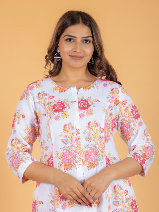 Women's Anarkali Soft Cotton Floral Print Women's Kurta Set - White