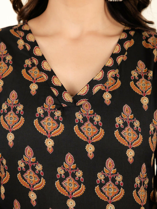 Women's Black Soft Cotton Floral Print Straight Kurta Pant Set for Women