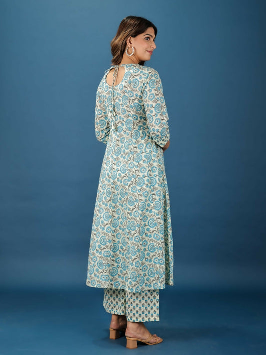 Women's Anarkali Soft Cotton Floral Print Women's Kurta Set - Off White