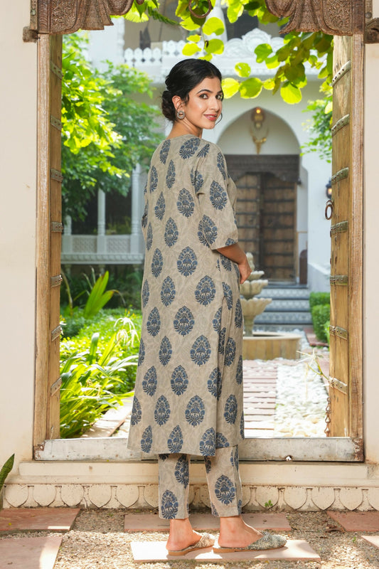 Women's A-line Linen Cotton Floral Print Women's Kurta Set - Grey