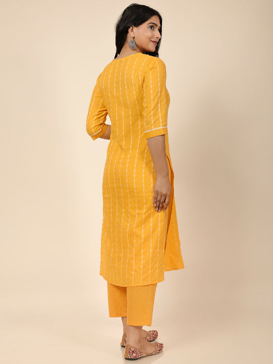 Women's Straight Kantha Cotton Woven Design Print Women's Kurta Set - Yellow
