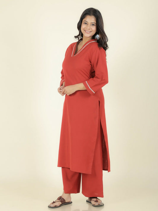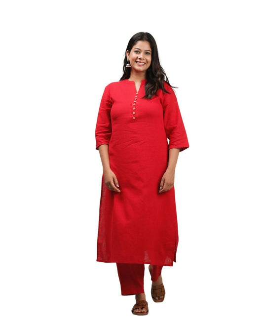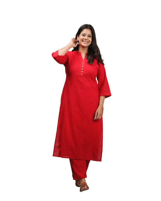 Women's Red Khadi Cotton Solid Print Straight Kurta Pant Set for Women