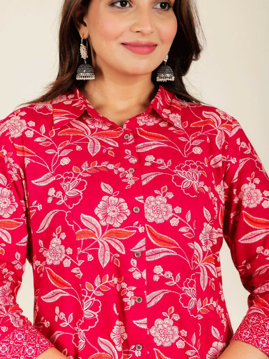 Women's Red Soft Cotton Floral Print High Low Kurta Pant Set for Women
