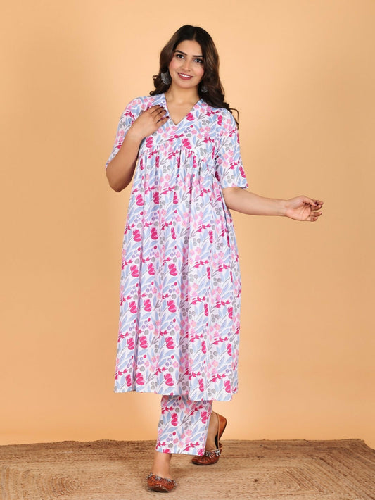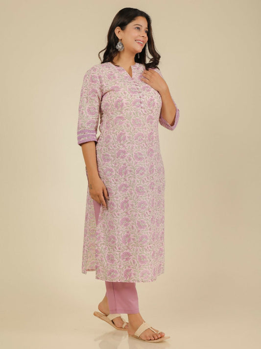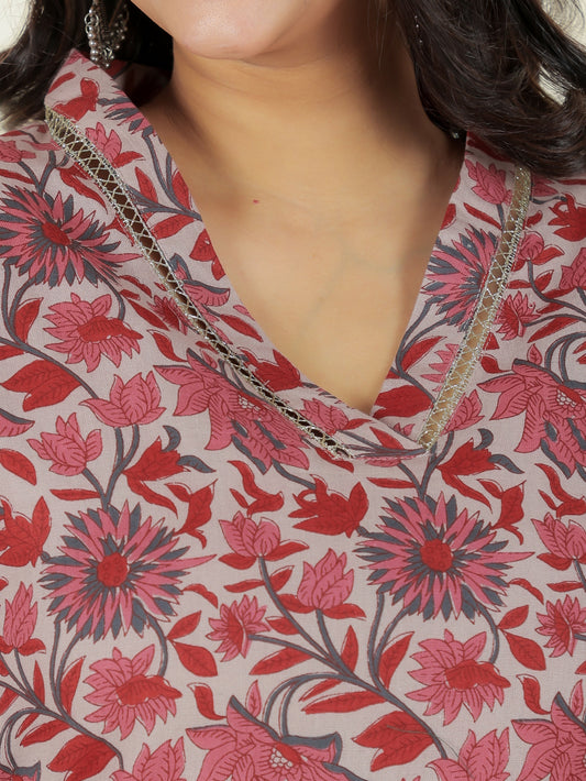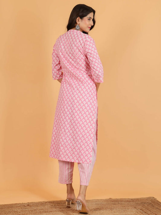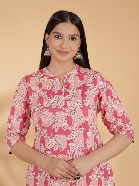 Women's Pink Soft Cotton Floral Print Straight Kurta Pant Set for Women