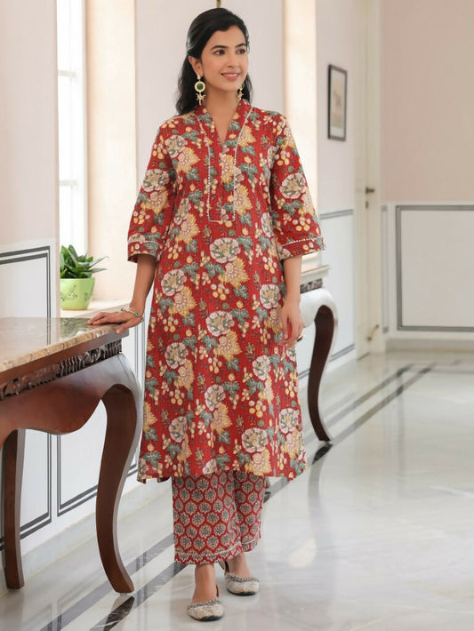 Women's Straight Kantha Cotton Floral Print Women's Kurta Set - Red