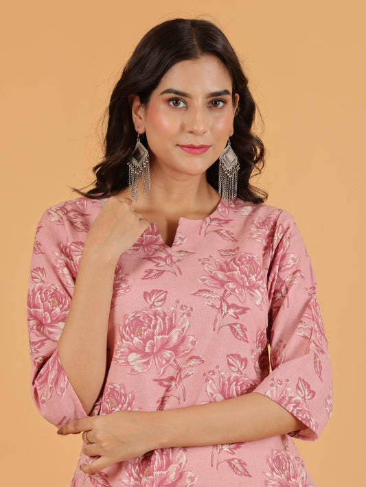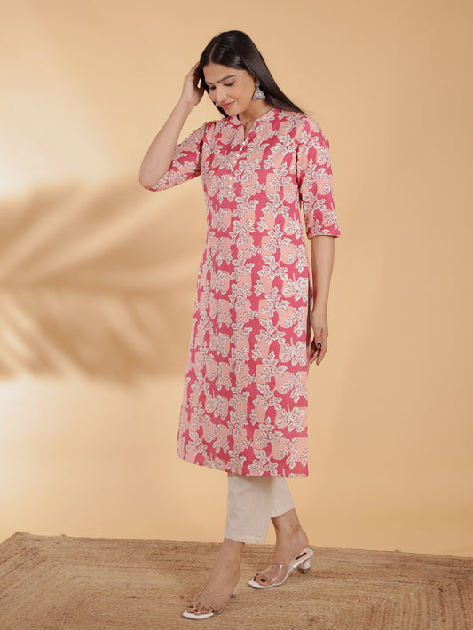 Women's Pink Soft Cotton Floral Straight Kurta for Women