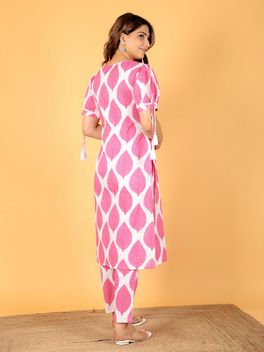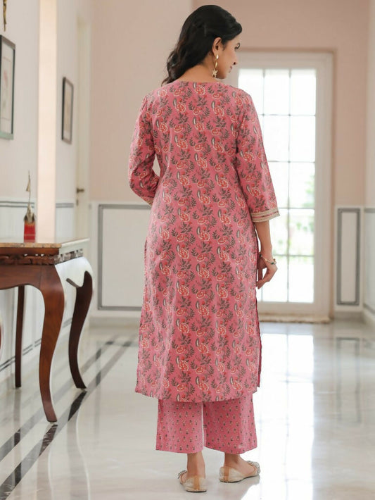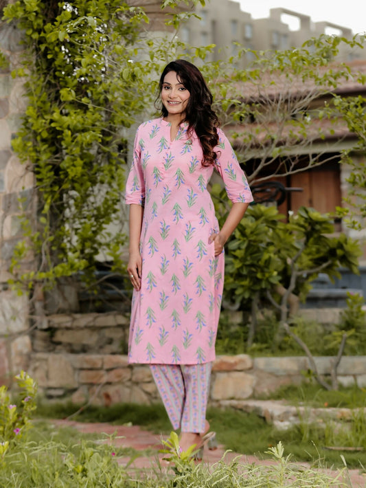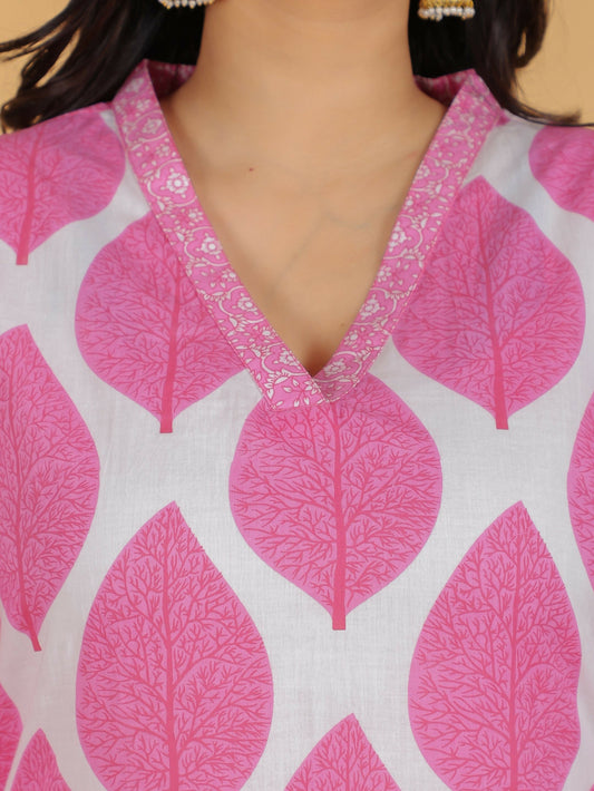 Women's Straight Soft Cotton Foliage Print Women's Kurta Set - Pink