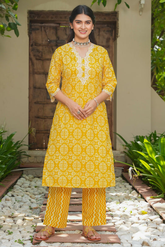 Women's Straight Soft Cotton Geometric Print Women's Kurta - Yellow