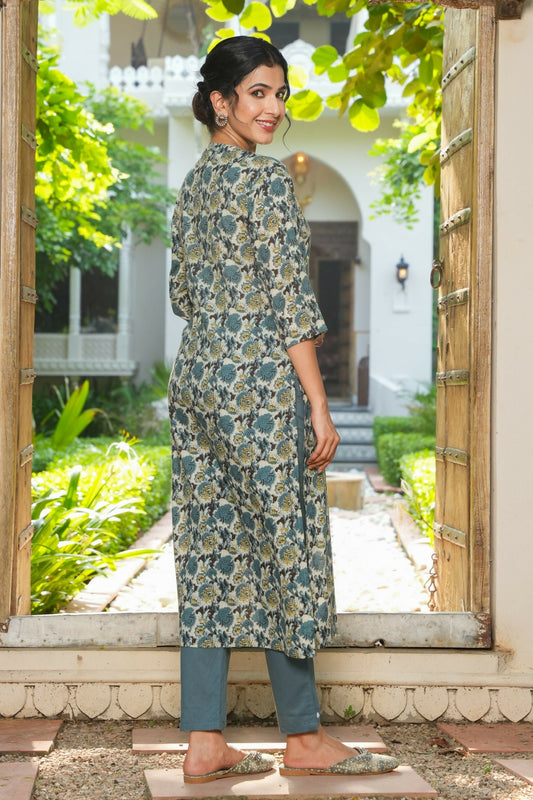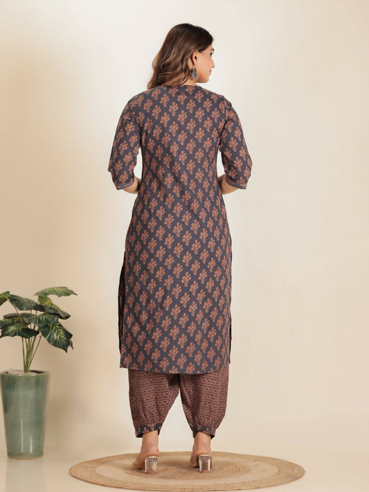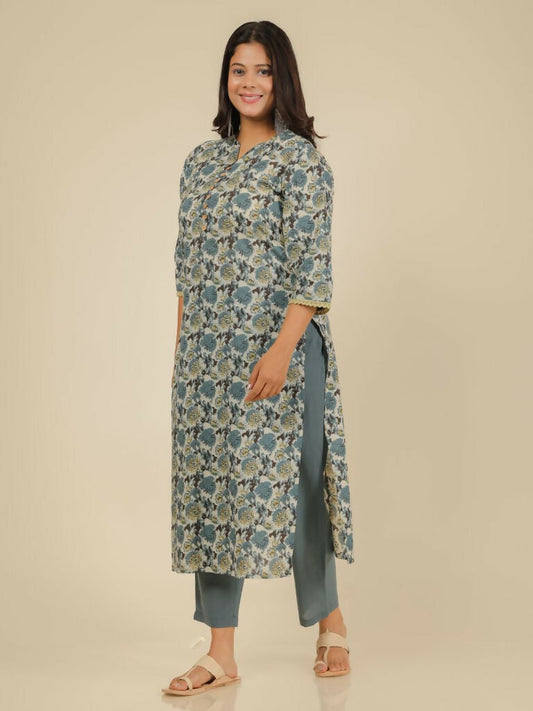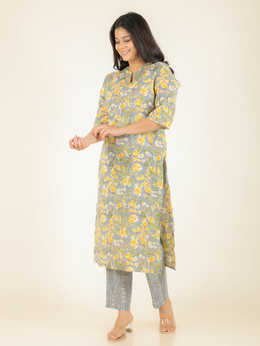 Women's Straight Soft Cotton Floral Print Women's Kurta Set - Grey