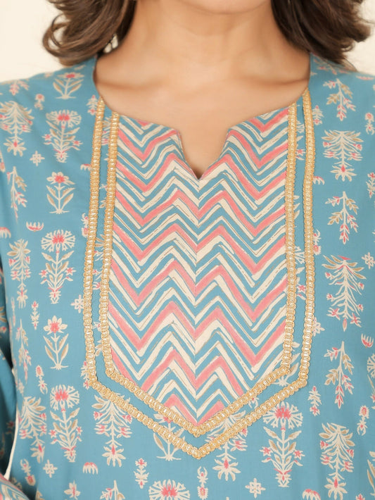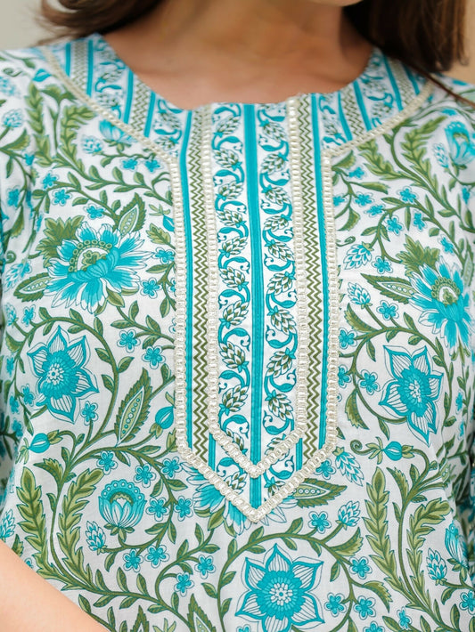 Women's Straight Soft Cotton Floral Print Women's Kurta Set - Turquoise