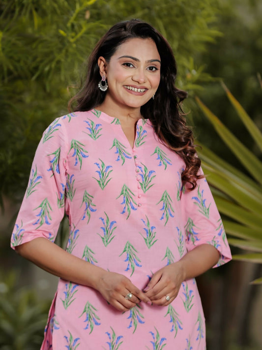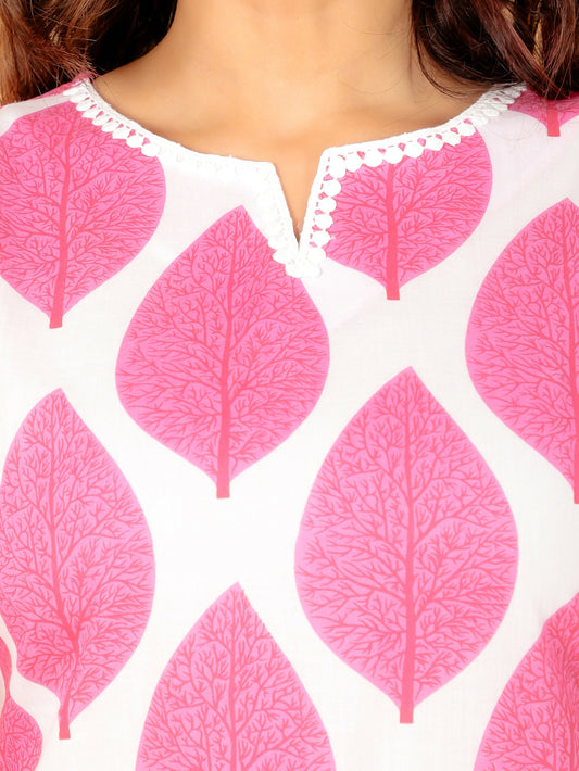 Women's Straight Soft Cotton Foliage Print Women's Kurta - Pink