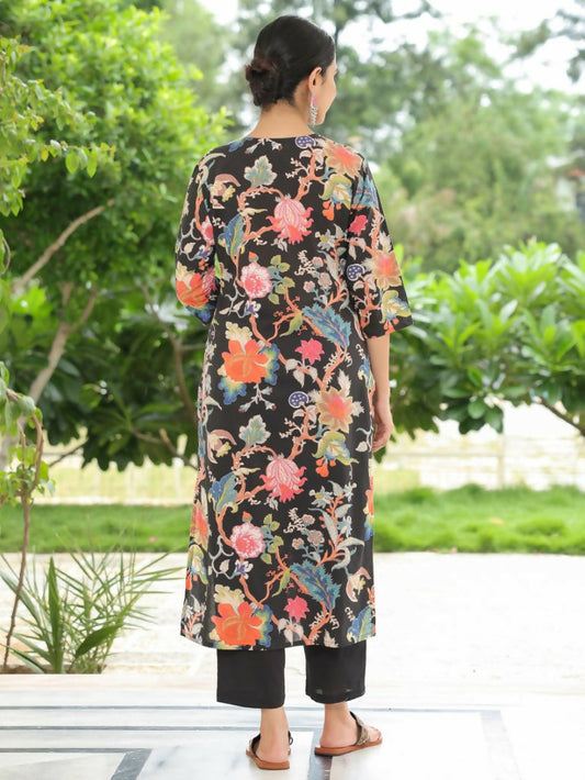 Women's Straight Soft Cotton Floral Print Women's Kurta Set - Black