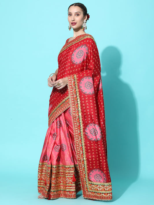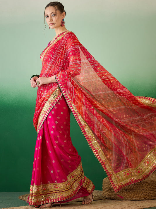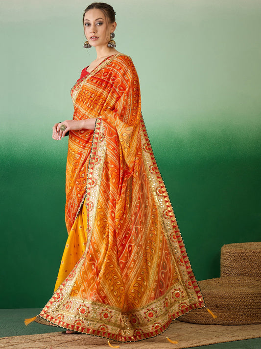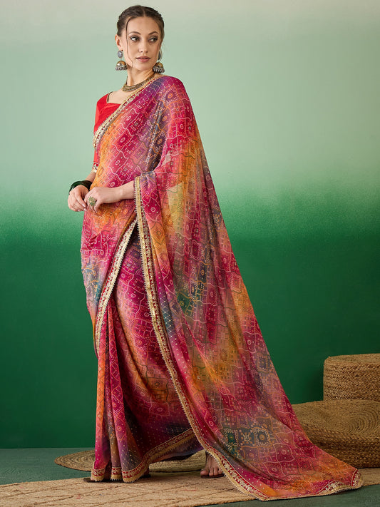 Dhiyona RV Women's Soft Exclusive Georgette With Bhandhani Print With Heavy Lace Saree With Blouse ( KVD2132 )