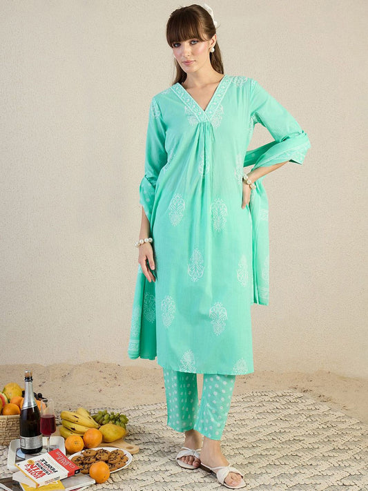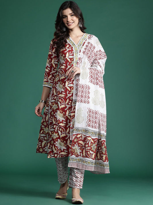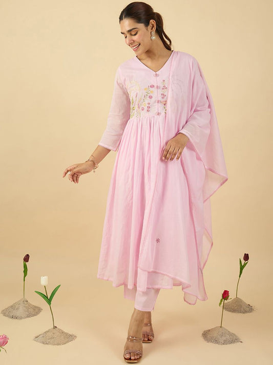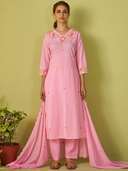 Dhiyona IE Floral Embroidered V Neck A Line Pure Cotton Kurta With Trousers & Dupatta