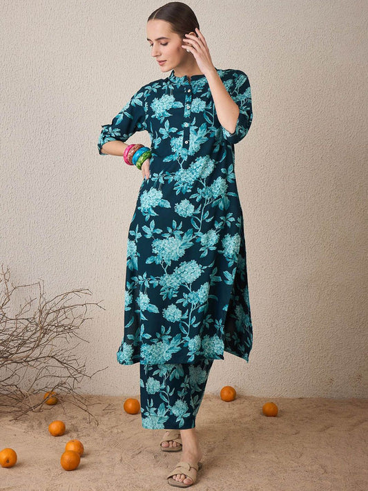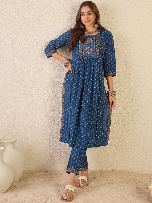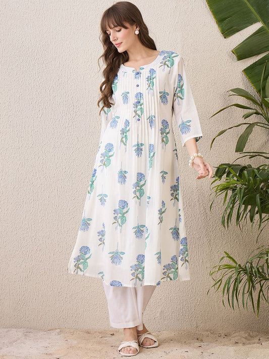 Dhiyona IE Floral Printed Round Neck Pure Cotton A-Line Kurta With Trouser