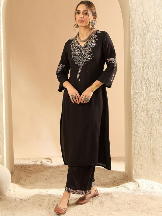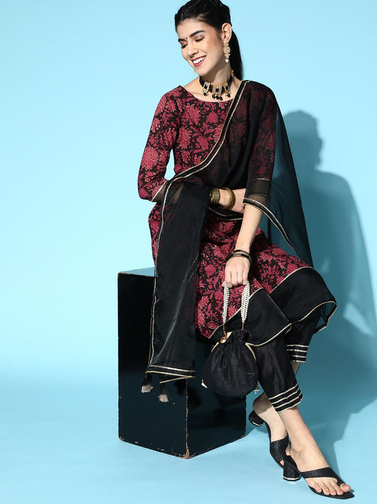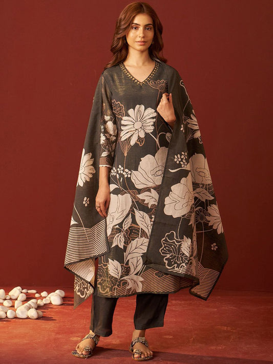 Dhiyona IE Floral Embroidered Thread Work Liva Straight Kurta With Trousers & Dupatta