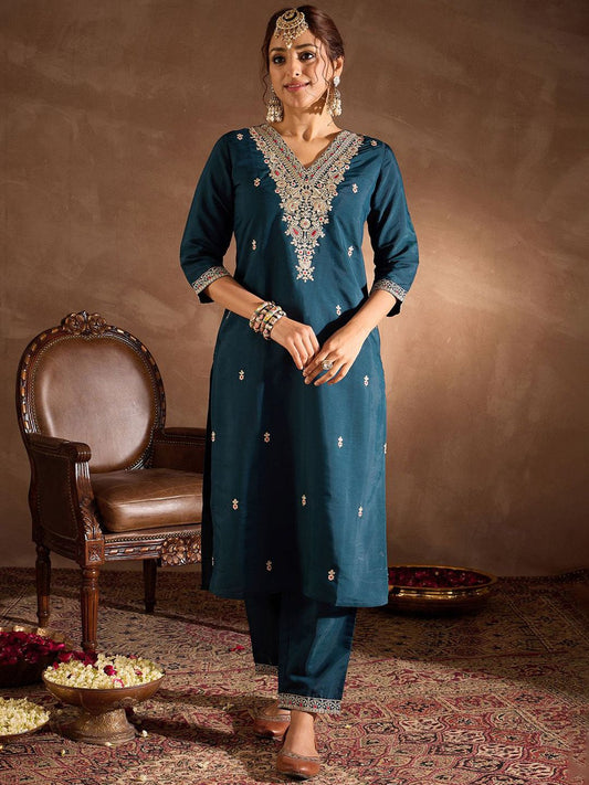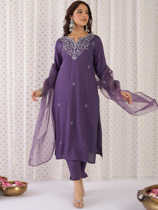 Dhiyona IE Paisley Embroidered Notch Neck Straight Kurta With Trousers & Dupatta