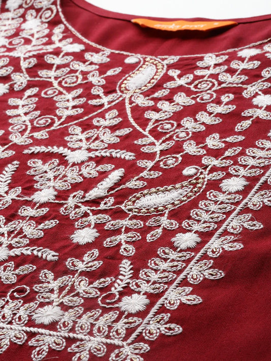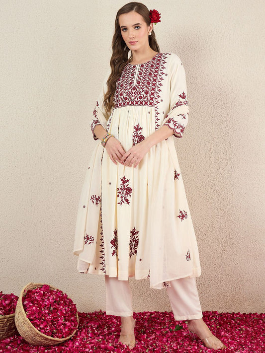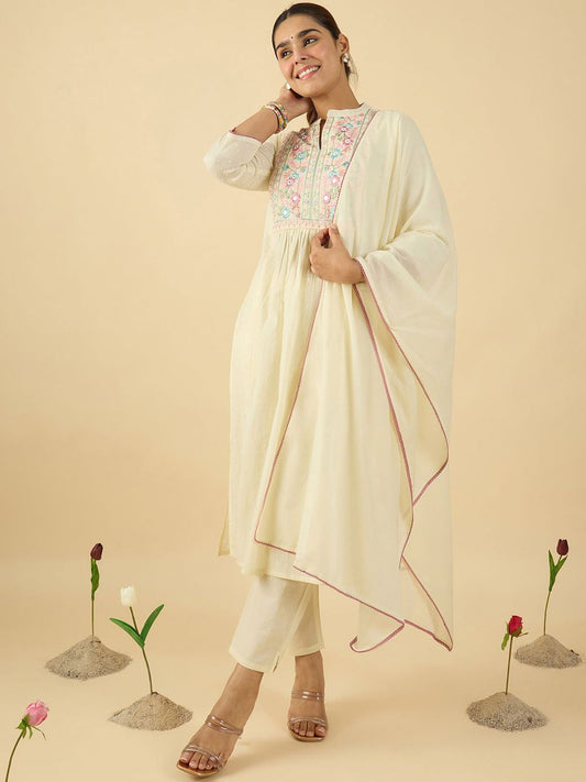 Dhiyona IE Floral Embroidered Mandarin Collar A Line Pure Cotton Kurta With Trouser &Dupatta