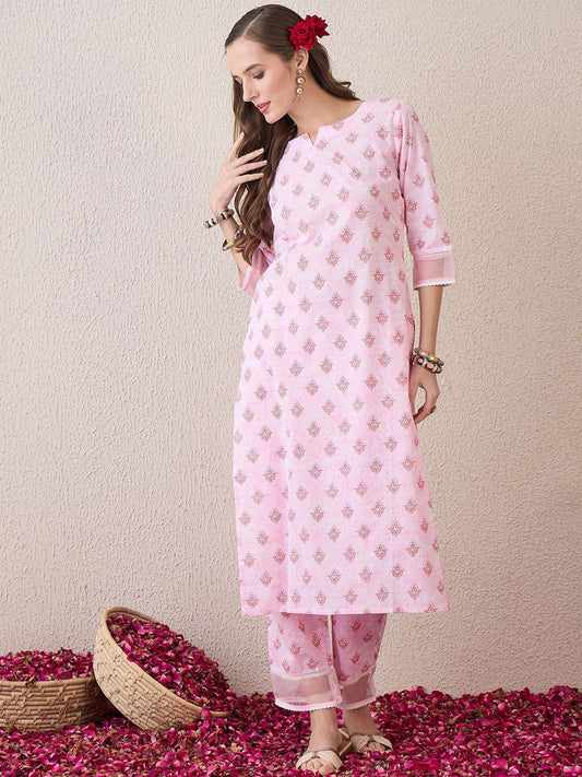 Dhiyona IE Floral Printed Round Neck Pure Cotton Straight Kurta With Trouser