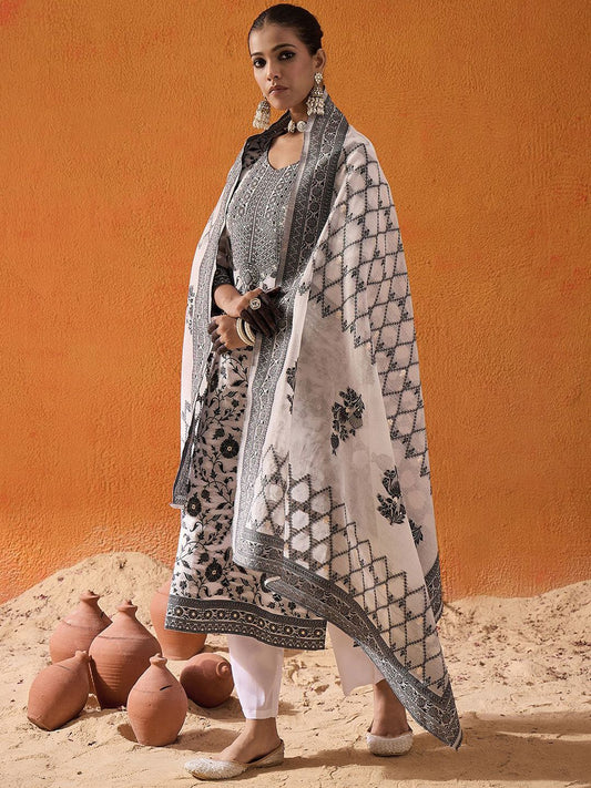 Dhiyona IE White Floral Printed V-Neck Straight Kurta with Trousers & Dupatta