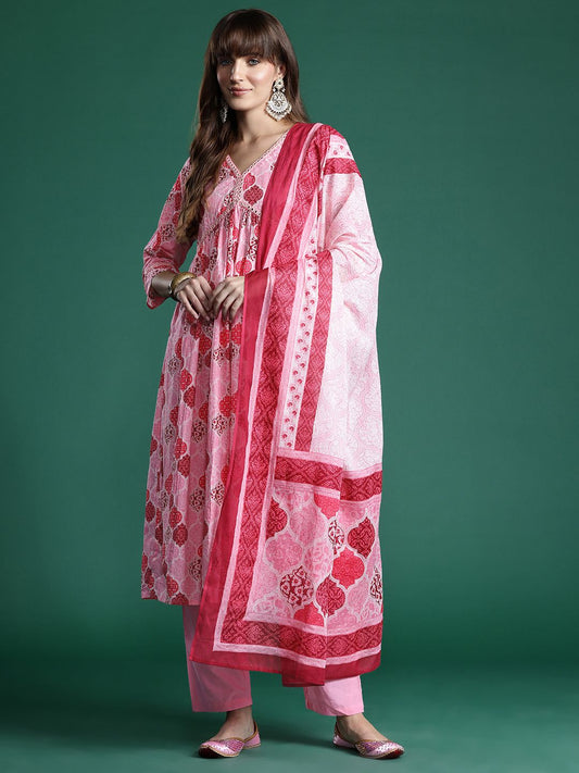 Dhiyona IE Geometric Printed Pure Cotton Kurta with Trousers & Dupatta