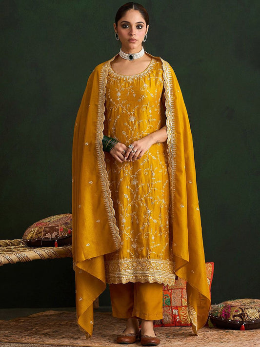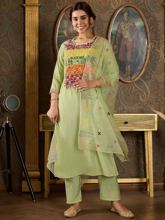 Dhiyona IE Floral Embroidered Mirror Work Straight Kurta With Trousers & Dupatta