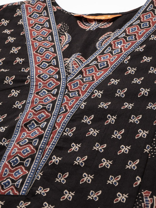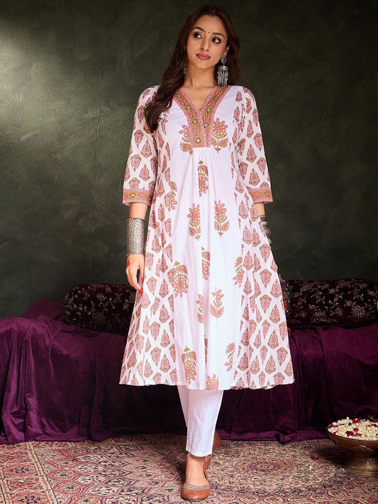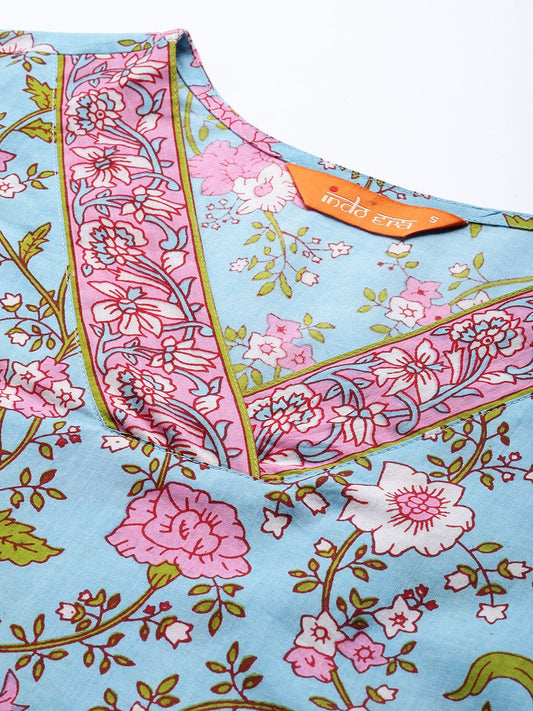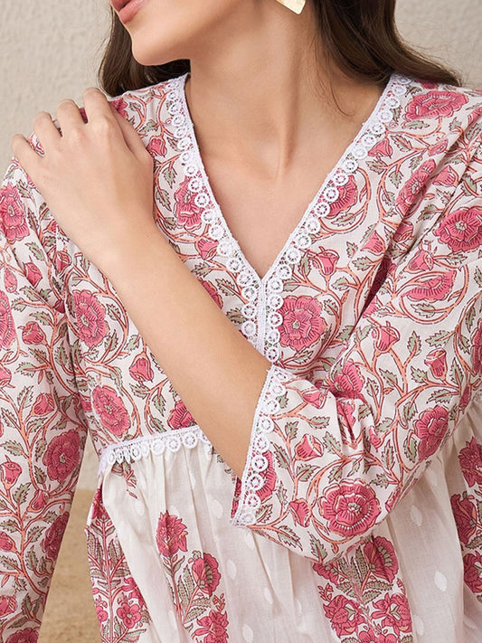 Dhiyona IE Floral Printed V-Neck Empire Pure Cotton A-Line Kurta With Trouser