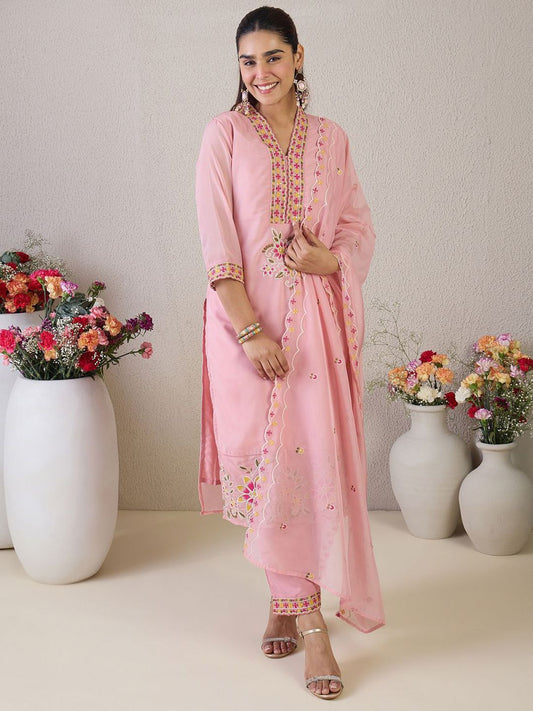 Dhiyona IE Floral Embroidered Embellished V-Neck Straight Kurta with Trouser And Dupatta