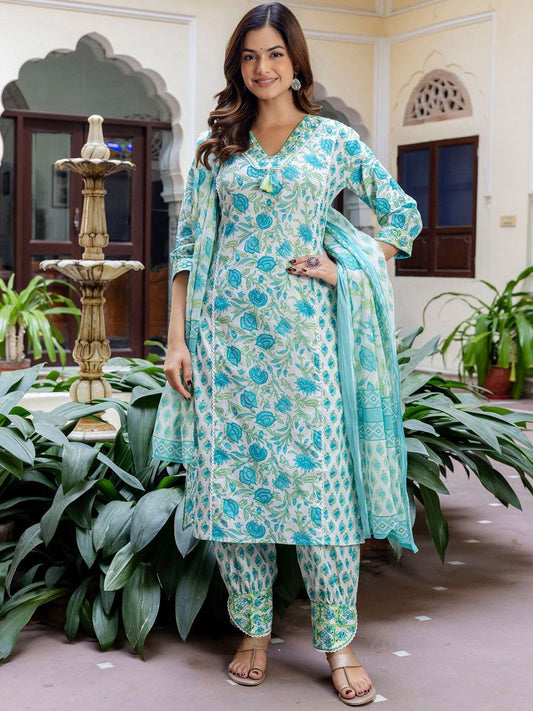 Dhiyona IE Floral Printed Gotta Patti Pure Cotton Straight Kurta with Trouser & Dupatta