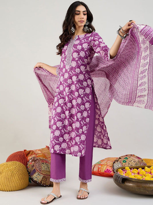 Dhiyona IE Floral Printed Mirror Work Pure Cotton Kurta With Trousers & Dupatta