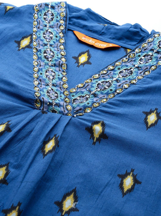 Dhiyona IE Ethnic Motifs Printed Panelled Beads & Stones Pure Cotton Kurta with Trousers