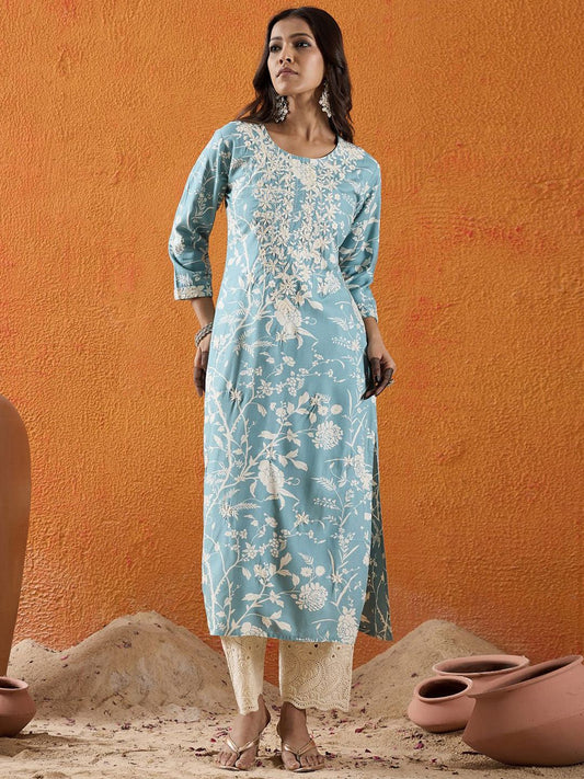 Dhiyona IE Floral Embroidered Thread Work Round Neck Straight Kurta