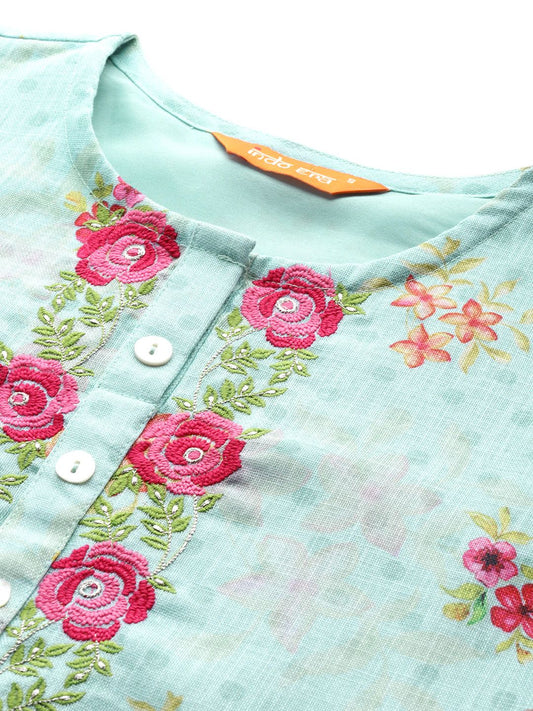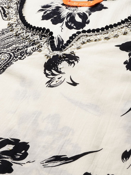 Dhiyona IE Floral Printed Notch Neck Beads & Stones Pure Cotton Kurta Trousers & Dupatta