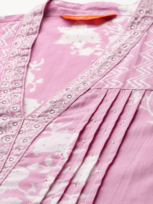 Dhiyona IE Women Printed Pleated Mirror Work Pure Cotton Kurta with Trousers