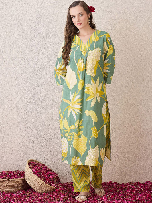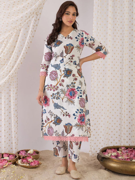 Dhiyona IE Floral Printed V-Neck Pure Cotton Straight Kurta With Trouser
