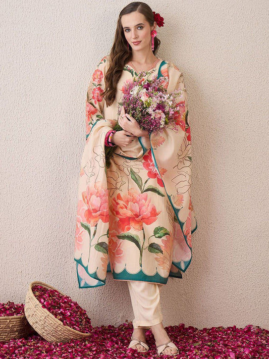 Dhiyona IE Floral Printed V-Neck Pure Cotton Straight Kurta With Trousers & Dupatta