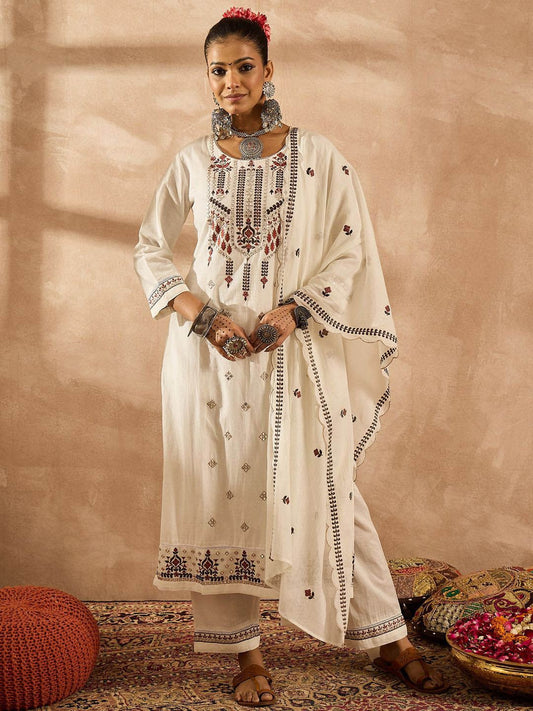 Dhiyona IE Ethnic Motifs Embroidered Pure Cotton Kurta with Trousers & Dupatta