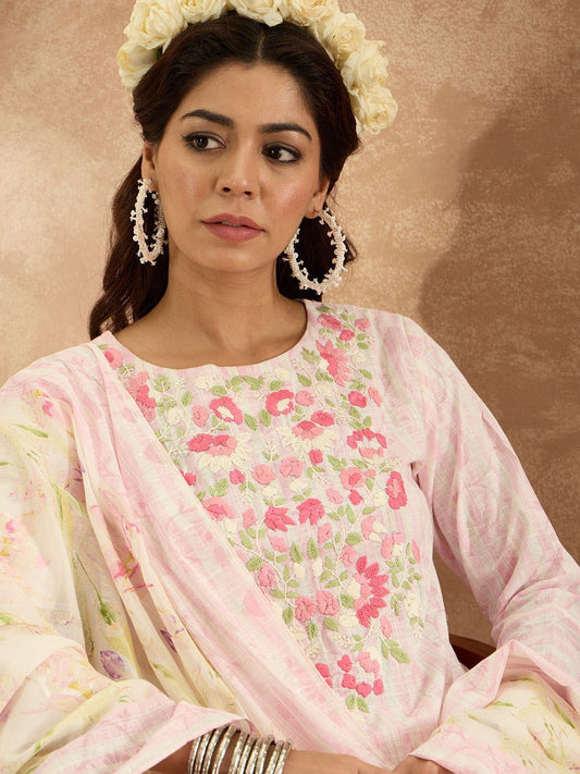 Dhiyona IE Floral Embroidered Pure Cotton Kurta with Trousers & Dupatta