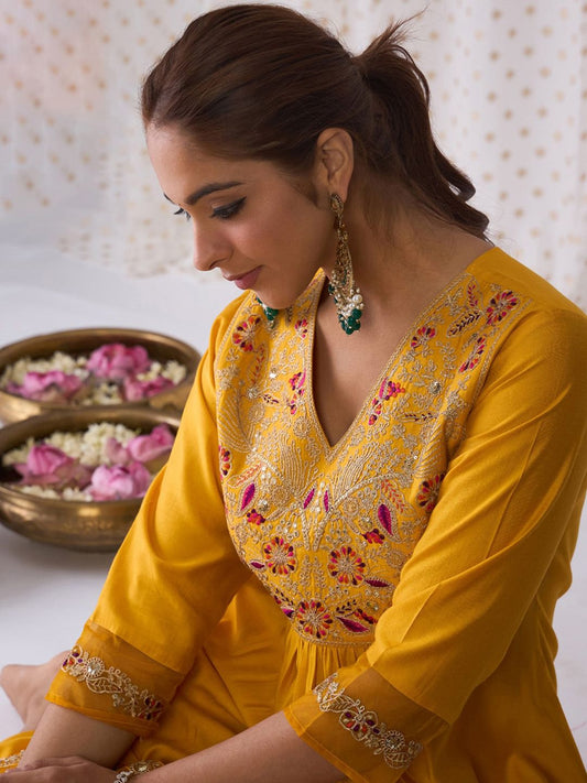 Buy 2 Get 1 FreeVendor:Dhiyona IEDhiyona IE Floral Embroidered Empire Liva A-Line Kurta With Palazzo & Dupatta