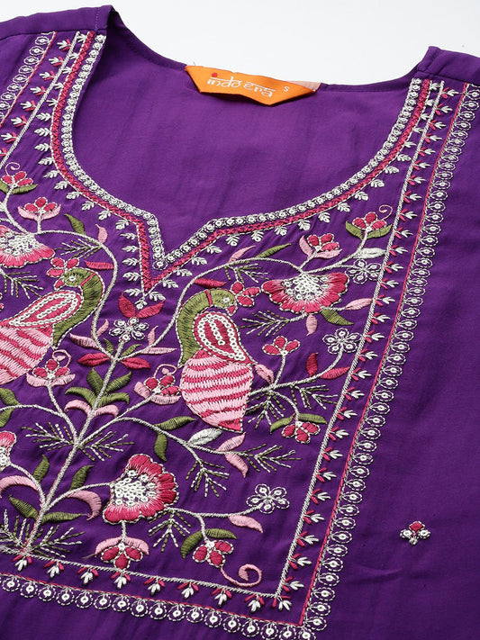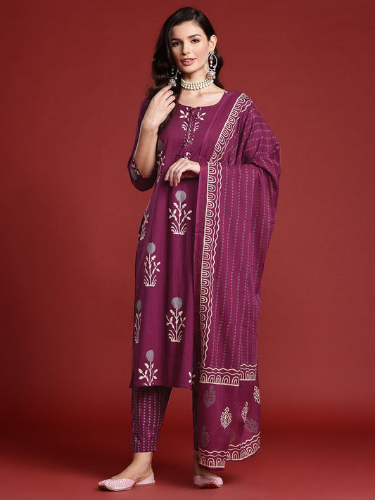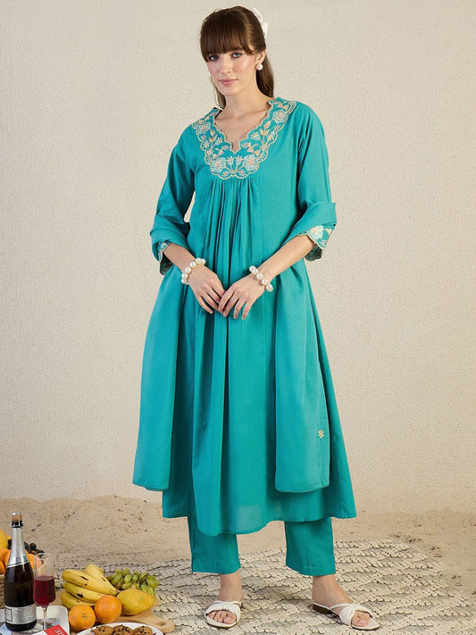 Dhiyona IE Floral Embroidered Thread Work Pure Cotton Kurta with Trousers & Dupatta