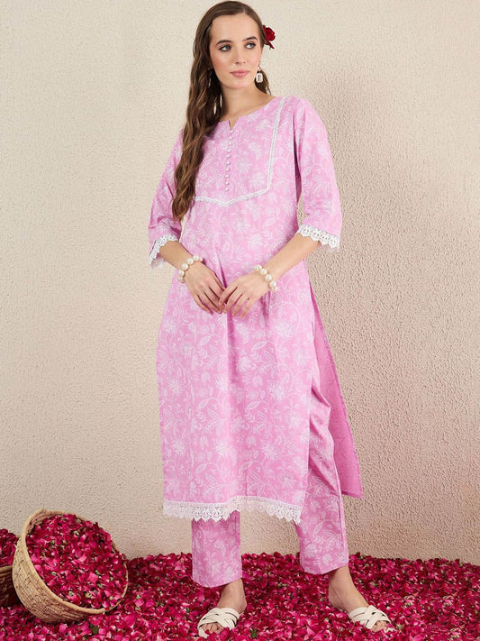Dhiyona IE Floral Printed Pure Cotton Straight Kurta With Trousers