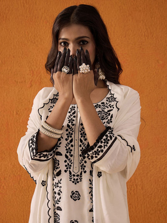Dhiyona IE White Floral Embroidered Straight Kurta with Trousers & Dupatta