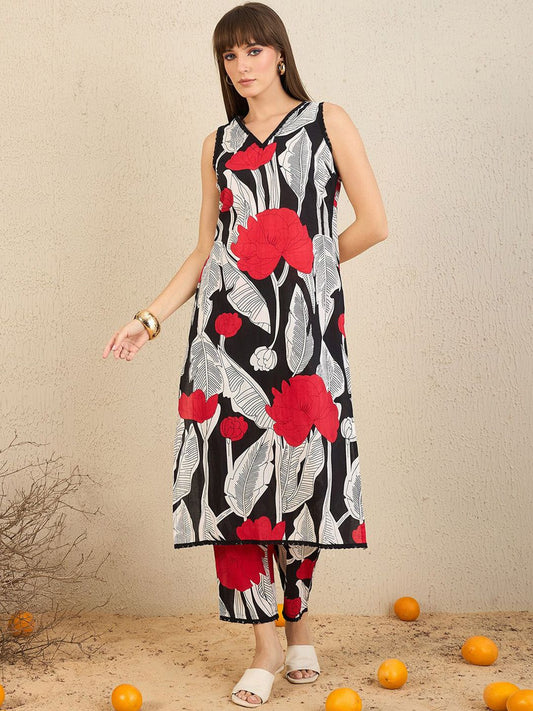 Dhiyona IE Floral Printed V-Neck A-Line Kurta with Trousers