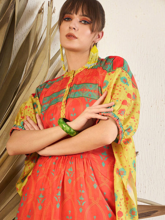 Dhiyona IE Orange Floral Printed Flared Kaftan Kurta with Trouser