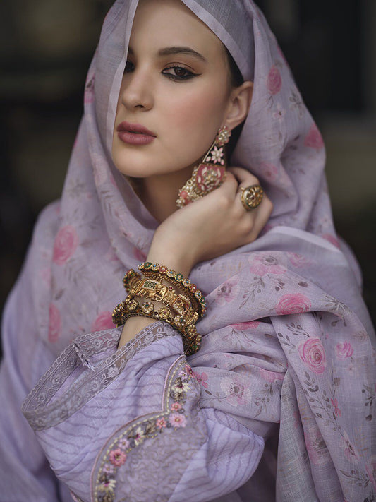 Dhiyona IE Lavender & Pink Floral Embroidered Thread Work Linen Kurta Set