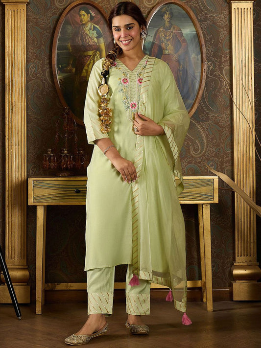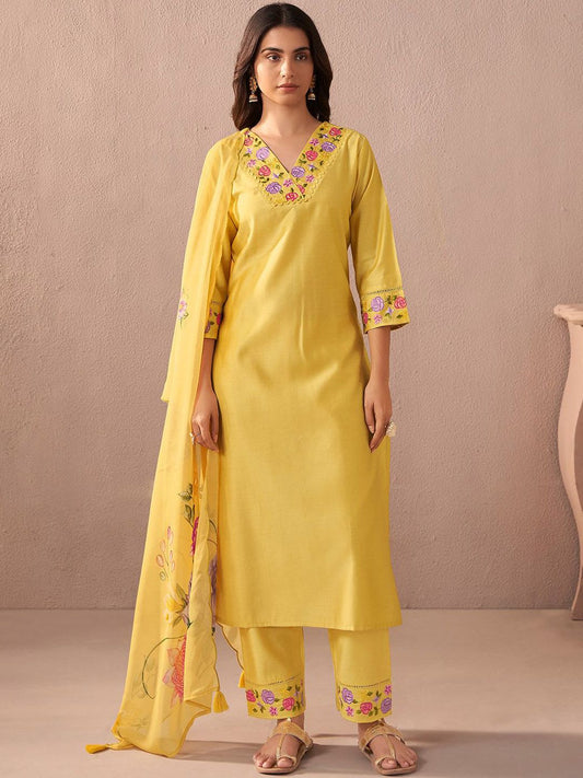 Dhiyona IE Floral Yoke Design V-Neck Thread Work Liva Straight Kurta With Trousers & Dupatta