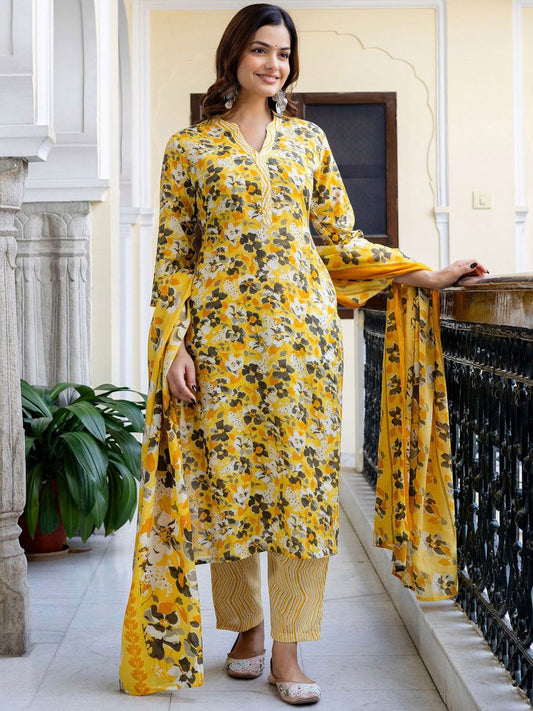 Dhiyona IE Women Floral Printed Cotton Kurta with Trousers & With Dupatta