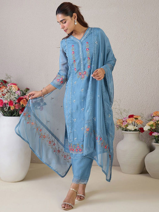 Dhiyona IE Floral Embroidered V-Neck Thread Work Straight Kurta With Trousers & Dupatta