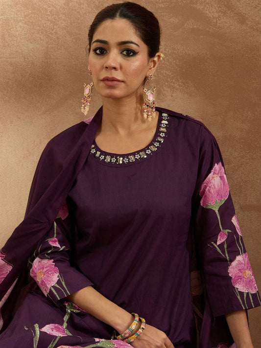 Dhiyona IE Plus Size Floral Printed Mirror Work Pure Cotton Kurta Set