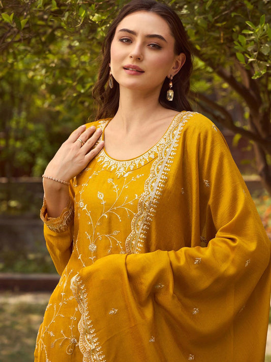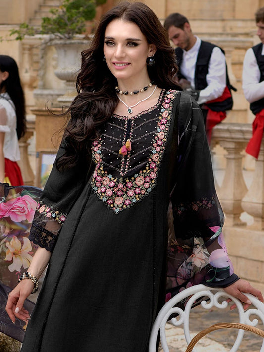 Dhiyona IE Floral Embroidered Round Neck Thread Work Straight Kurta & Trousers & Dupatta